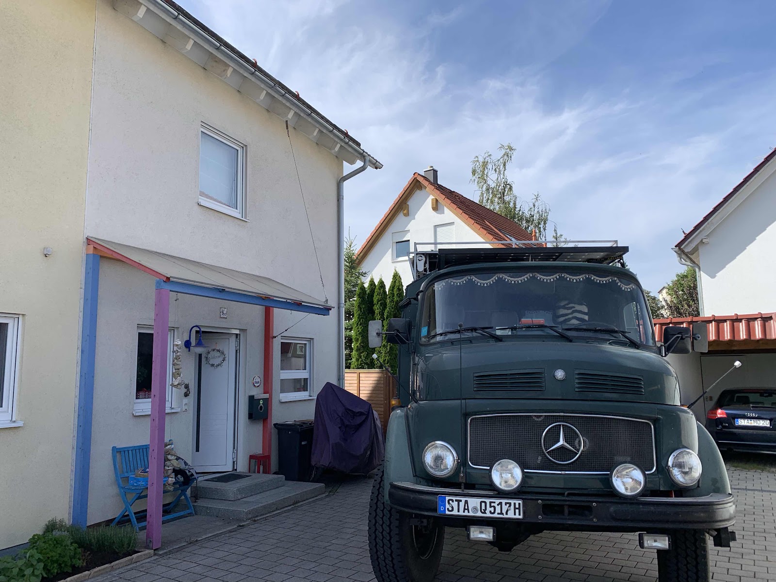 Los geht’s. Gepackt wird im Hof, da der Laster ja zur Zeit keinen eigenen Parkplatz hat. :-(